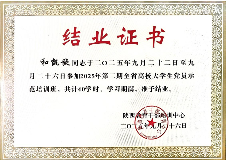 为贯彻落实《全国党员教育培训工作规划(2024-2028年)》和全省党员队伍“分级分类、全覆盖集中培训”四年行动计划工作安排,切实提升高校新发展党员政治素养与理论水平,陕西省委教育工委于9月22日-9月26日在延安大学举办了全省高校大学生党员示范培训班。来自全省各高校2024年以来新发展的大学生党员代表共120名学员参加培训,沉浸式接受红色教育与党性淬炼。我校信息工程学院2022级数据科学与大数据技术专业和凯旋同学作为代表参加此次示范培训。