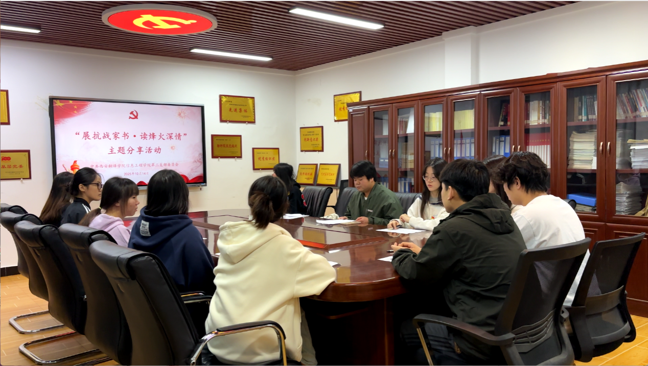为重温革命先烈的赤诚担当,深入挖掘抗战家书所承载的厚重家国情怀,同时大力弘扬爱国主义精神,传承红色基因,从抗战历史中汲取奋进力量。2025年10月14日,信息工程学院第三党支部在党员活动室组织开展“展抗战家书·读烽火深情”主题分享活动,活动由支部组织委员徐鹤毓同志主持。