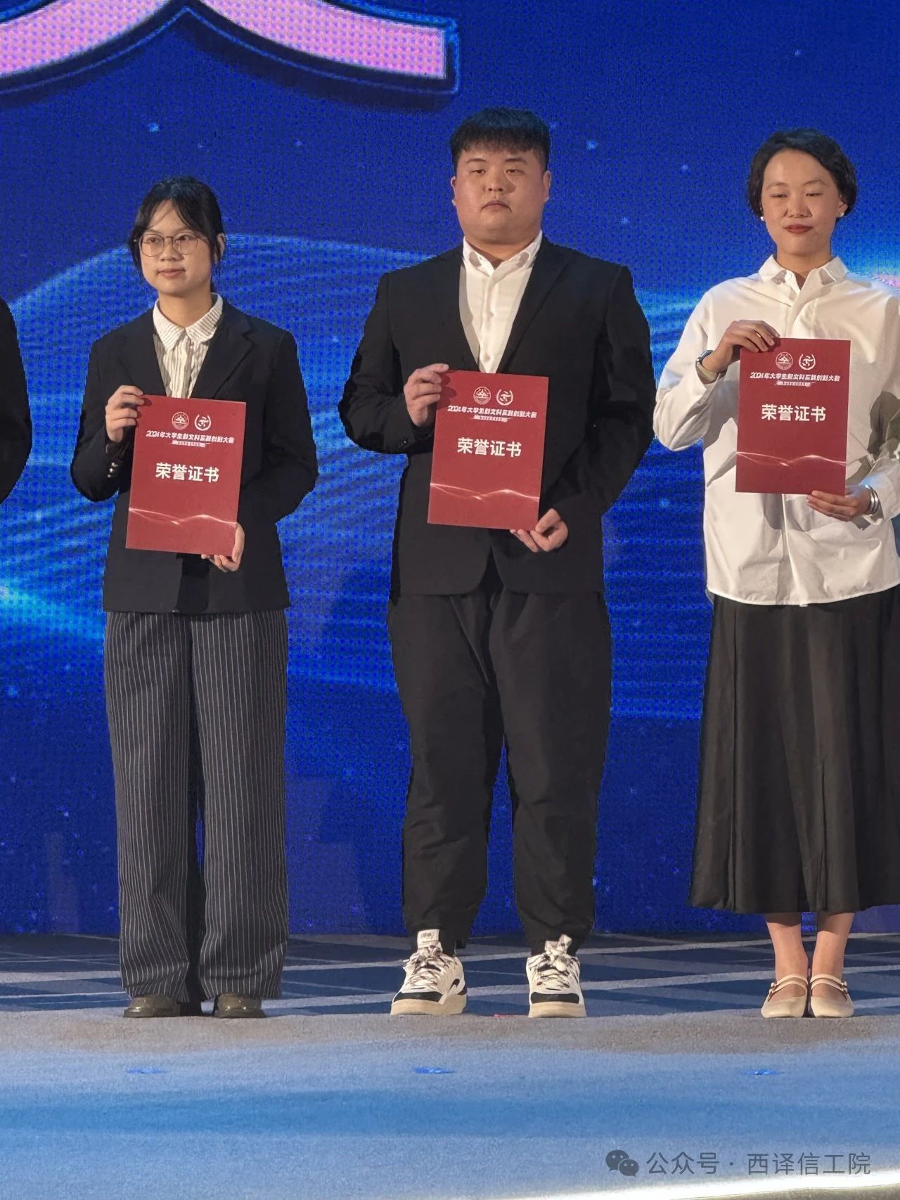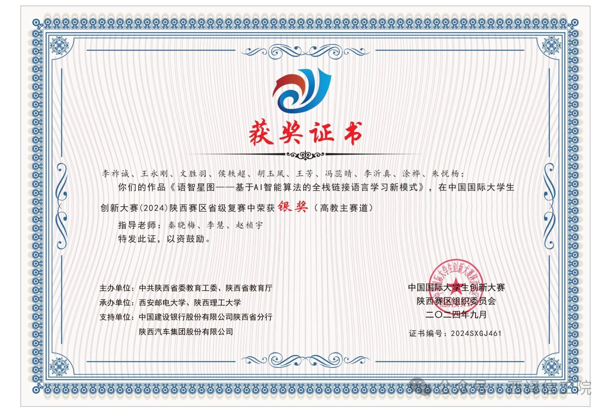 在决赛的舞台上,我院“语智星图”团队将信工院学子的卓越风尚展现得淋漓尽致,以良好的发挥获得了专家评委的肯定。来自信息工程学院李祚诚、侯轶超、胡玉凤等8位同学精心打造的作品《语智星图--基于AI算法的全栈链接语言学习新模式》荣获比赛金奖,他们专注于构建中国本土特色文化语料库。语料涵盖丰富的传统文化素材,诸如红色旅游、古诗词、民间故事等,不仅为汉语学习者提供原汁原味的语言环境,帮助他们深入理解汉语的文化底蕴;对于外语学习,以本土特色内容为依托进行翻译、对比学习,能精准传达中国文化内涵,助力 “一带一路” 等对外交流场景下的语言互通,为跨文化交流奠定坚实的语言数据基础。此项目团队同时在中国国际大学生创新大赛(2024)陕西赛区省级复赛中荣获银奖。