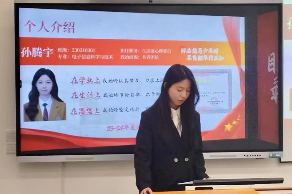 在优秀共青团员答辩中,共青团员们有序登台,从专业学习成绩、社团活动经历、公益服务实践等角度,进行了全面且精彩的介绍。他们用详实的事例和真切的感悟,展现了拼搏奋进的青春姿态,践行着共青团员的初心使命,展现出新时代青年积极向上、勇于担当的精神风貌。