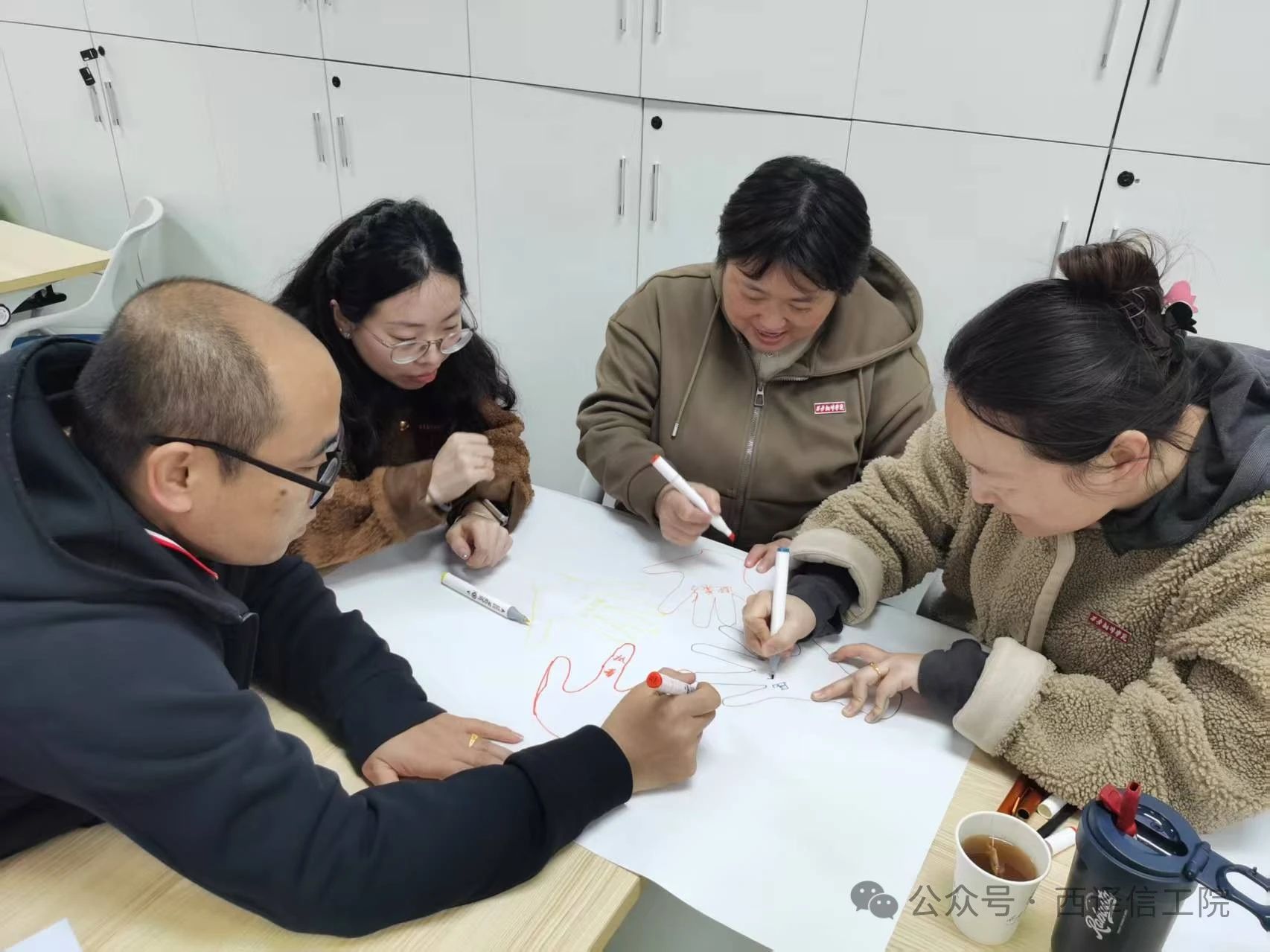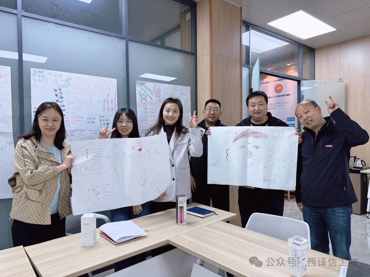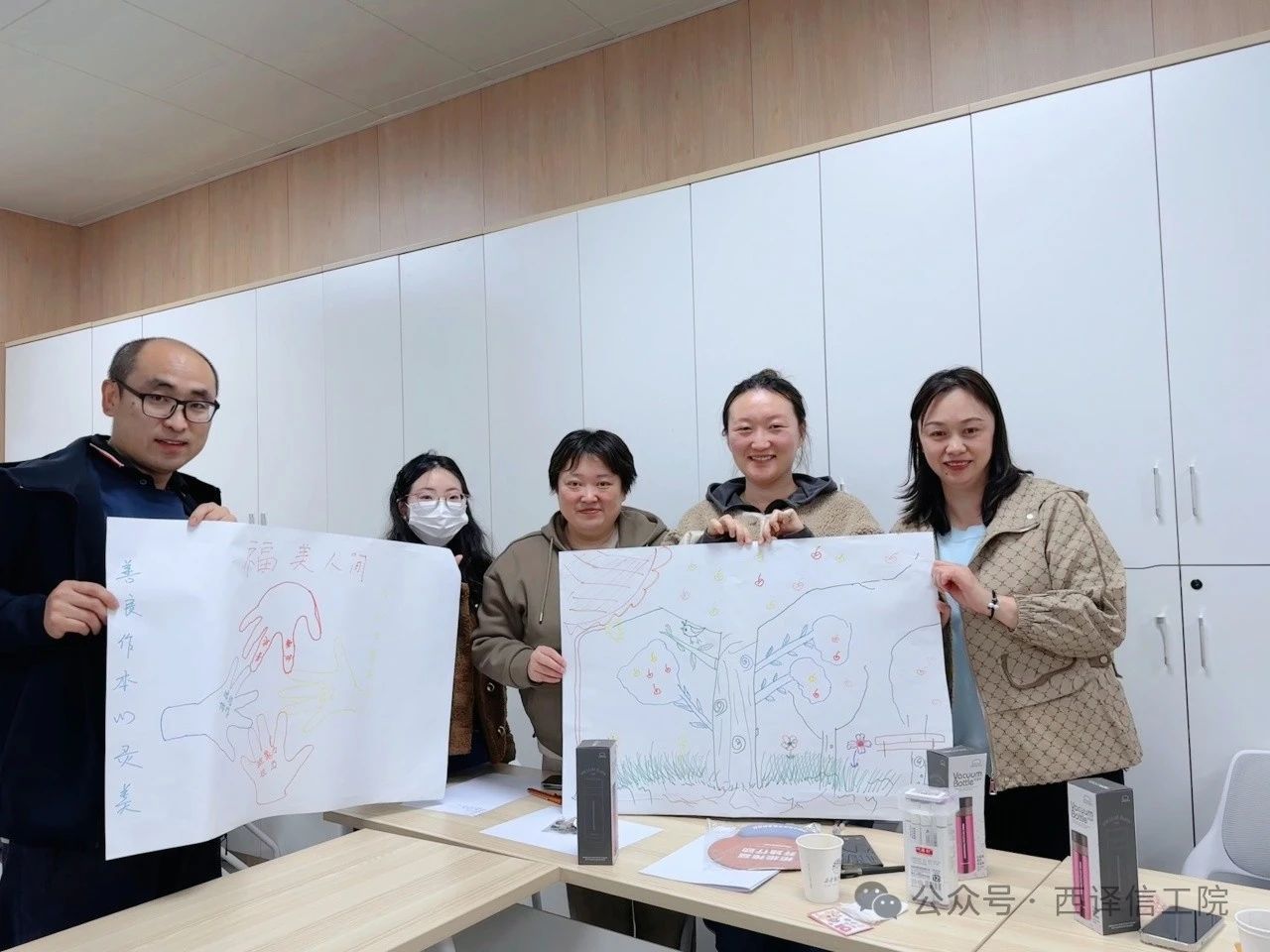 “绘手图”环节,通过描绘手型、书写团队特质、创作主题对联等,意在增强团队协作意识,帮助辅导员在开展学生生涯规划时体悟个人与团队的紧密联系;小组成员在无声沟通下集体创作的“集体作画”,极大提升了团队的默契,彰显了个人创意与团队协作的融合魅力。