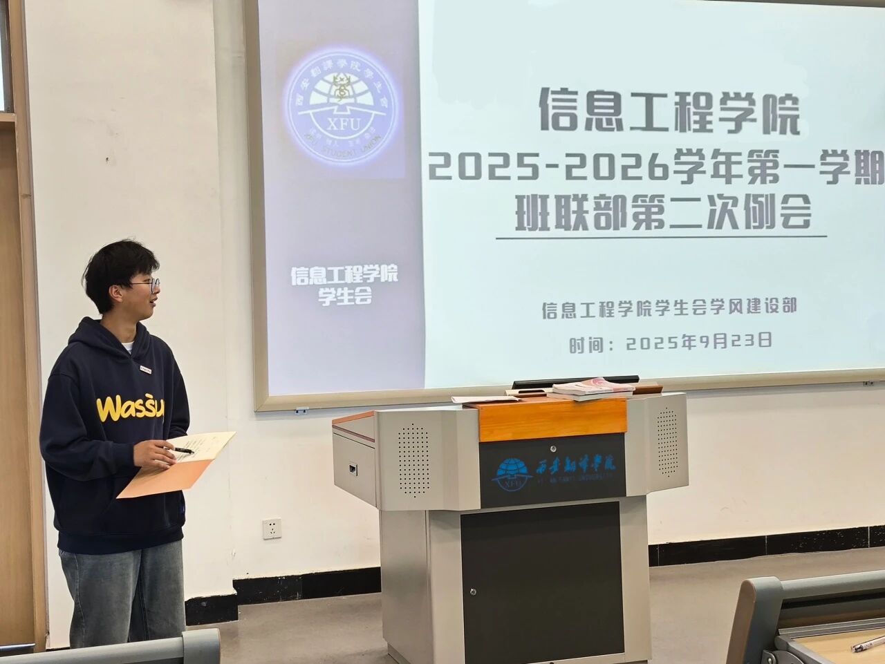 为推动信息工程学院学风建设走深走实,明晰新学期班级管理的重点任务,进一步强化班级凝聚力与学生综合素养,学生会于9月23日在722T教室召开2025-2026学年第一学期第二次班联会。信息工程学院团总支书记王荣平、2025级班长参会,会议由学生会主席团成员梁茹萍主持。
