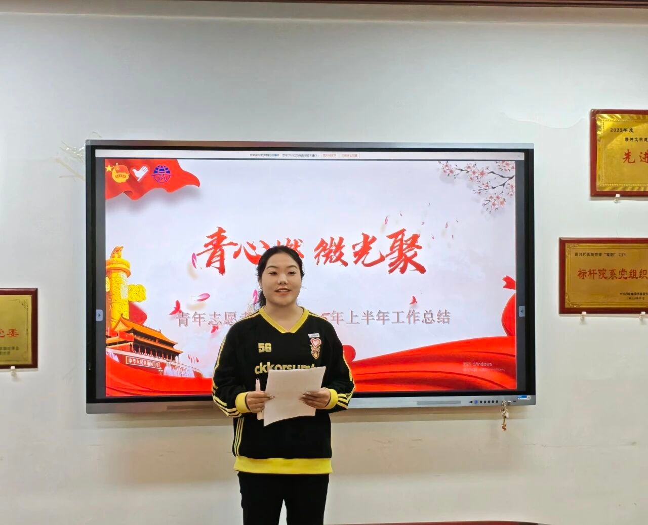 首先,团总支组织部部长田梦楠从思想引领与组织建设两个方面进行汇报:思想引领上,通过主题团日、团校培训、红色传承等社区活动与团干部大赛、党团知识竞赛等比赛,强化团员信念;组织建设上,推进团支部规范化,完成入党培养对象推优、毕业团员升学衔接,规范团务工作;系统的展示了团总支在推进团学教育,强化团员意识,帮助青年成长方面取得的成效。