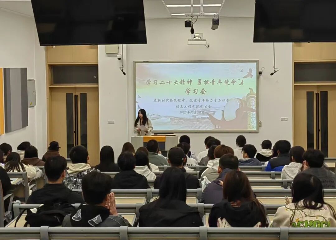 为了聚焦青年责任与时代使命,激励广大青年学子坚定理想信念,勇担时代重任,信息工程学院学生会于2025年10月20日在722t召开“学习二十大精神,勇担青年使命”主题学习会。本次会议由学生会秘书部部门负责人孙怡琳主持,全体学生会成员参与。