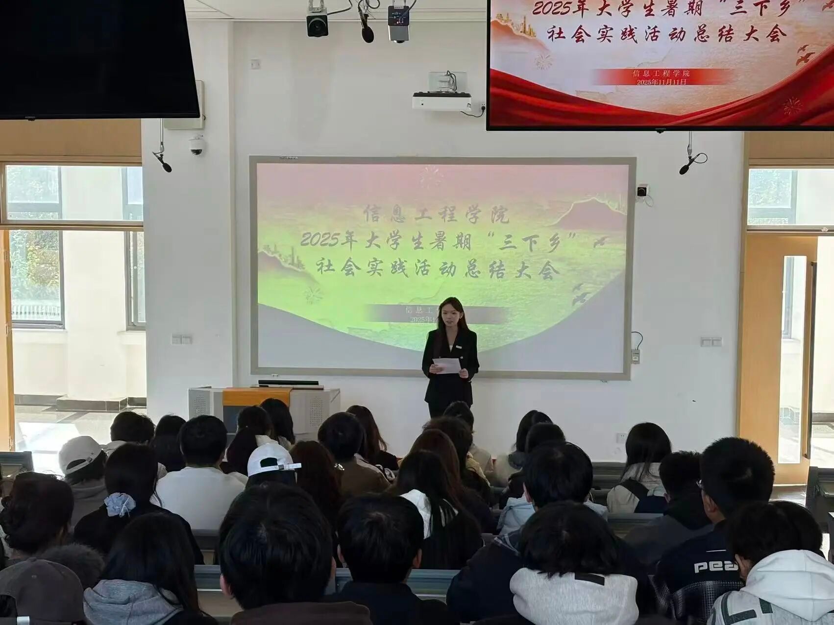 金秋送爽,硕果飘香。为全面系统复盘 2025 年大学生暑期 “三下乡” 社会实践工作成效,提炼可复制、可推广的实践经验,进一步凝聚全院青年投身基层服务、助力乡村振兴的思想共识,信息工程学院团总支于2025年10月11日在732t召开暑期 “三下乡” 社会实践总结会议。信息工程学院团总支副书记陈雨婷、学生副书记田梦楠、吴佳欣,团总支秘书长范旭航出席会议,学院十支暑期 “三下乡” 实践团队的全体成员及部分学生代表共同参会,会议由团总支干事主持。