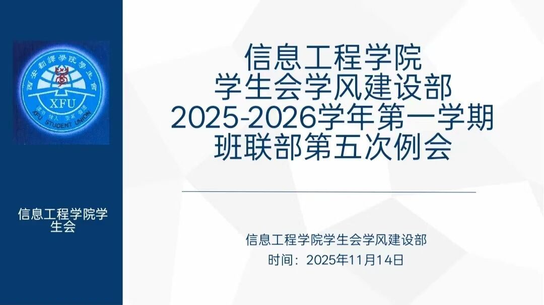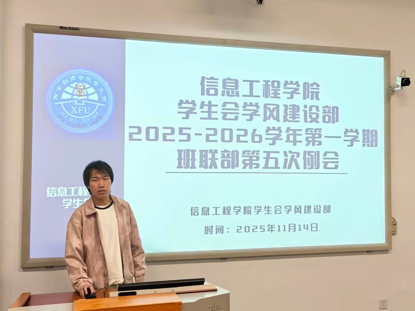 为筑牢生态保护根基,提升学生的生态防护意识与保护野生动物责任感,同时强化校园禁烟宣传与执行力度,全面培育健康文明的校园生活素养。信息工程学院学生会于2025年11月14日,在722t开展2025-2026学年第一学期班联部第五次例会。会议由信息工程学院学生会学风建设部部长梁佳浩主持。