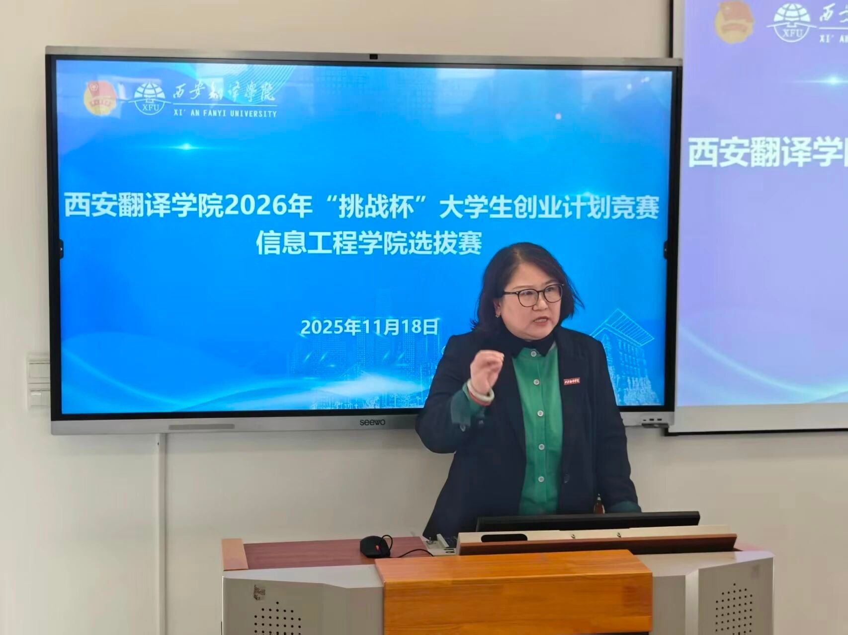 赛前动员阶段,王珍院长登台致辞。她首先向在百忙之中莅临现场指导支持的评委老师们表达了诚挚的感谢。她强调,“以赛促学、以赛促创”是创新创业类竞赛的核心价值,鼓励同学们把握宝贵机会,持续优化项目内容、提升现场展示能力,在实战中拓展眼界、明确发展方向,充分展现信息工程学院的专业特色与学子实力,团结协作、锐意进取,力争在更高级别的赛事中再创佳绩,重现信息工程学院“挑战杯”辉煌。