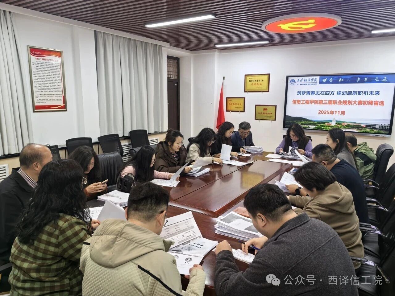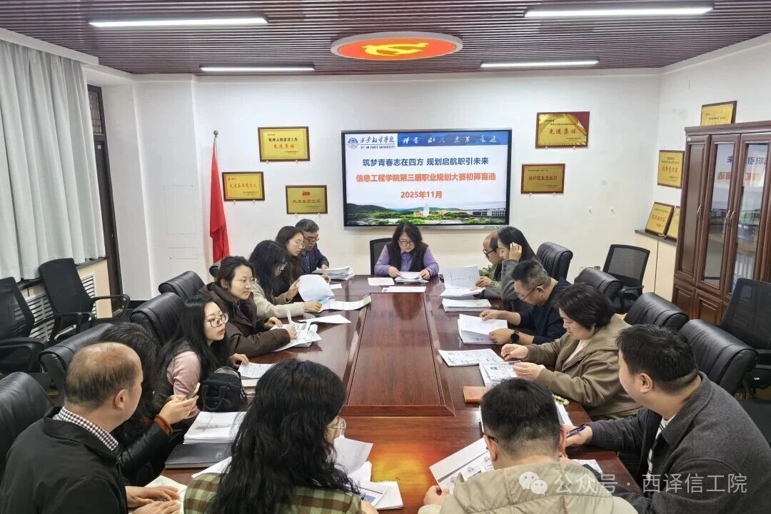 为切实帮助同学们树立科学择业观、进一步明确职业发展方向、全面提升就业核心竞争力,信息工程学院于11月11日在党员活动室开展2025年职业规划比赛院级初赛。信息工程学院党委书记、行政副院长王珍,综合办副主任王晓东及全体辅导员组成评审团,对参赛作品进行细致审阅与严格筛选。