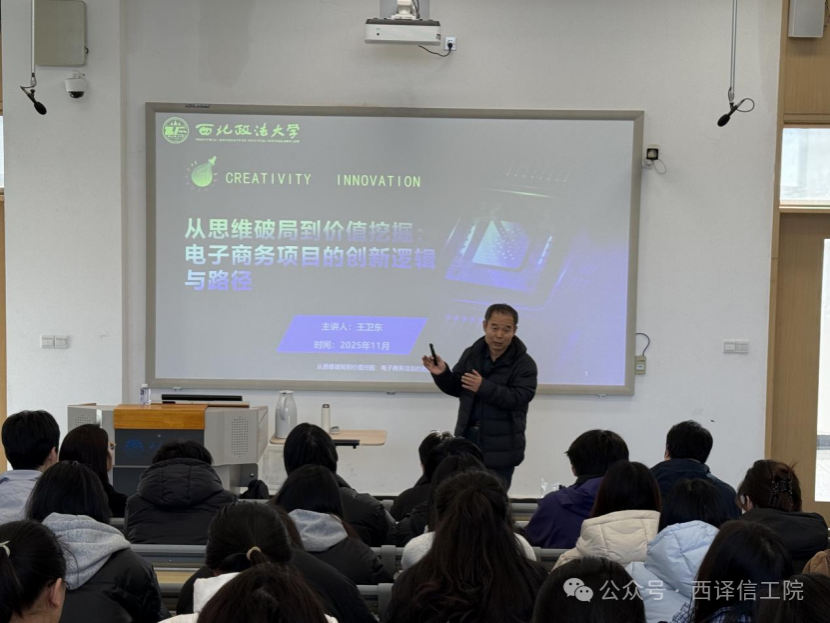 2025年11月25日下午,信息工程学院电子商务专业在732T成功举办了题为《从思维破局到价值挖掘:电子商务项目的创新逻辑与路径》的专题讲座。本次讲座特邀西北政法大学王卫东教授担任主讲,电子商务专业负责人冯晓兰老师主持,司滨滨、杨露、畅嘉伦、赵梦远等多位专业教师及电子商务专业学生共同参与。
