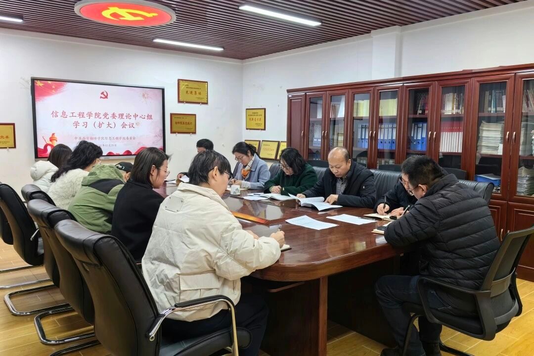 信息工程学院党委于2025年11月25日在党员活动室召开理论学习中心组学习(扩大)会议。会议由信息工程学院党委组织委员、党务干事沈平利同志主持,信息工程学院党委书记王珍同志,党员院领导、教学副院长王艳丽同志,党委委员及各支部书记参会。