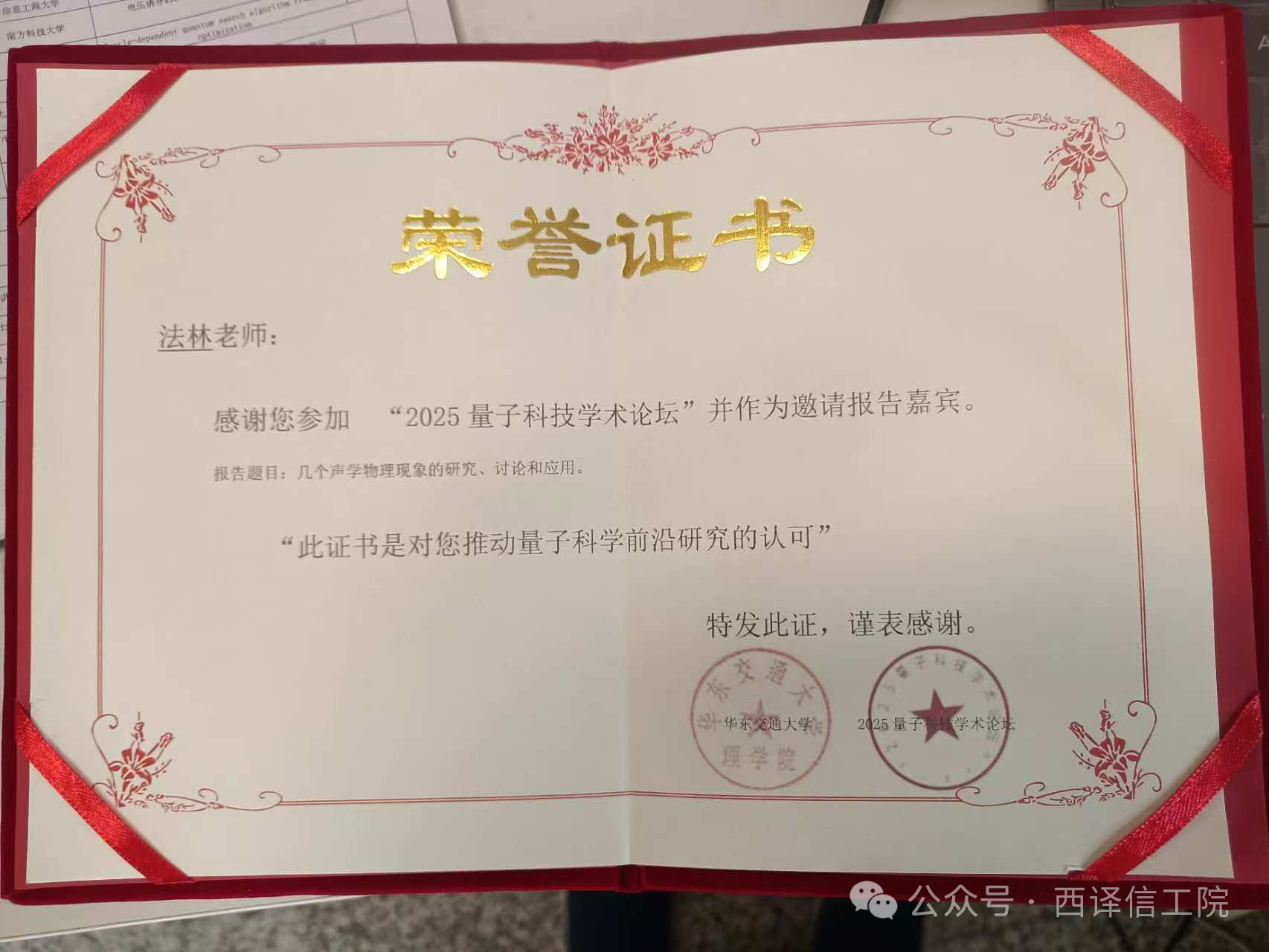 2025年12月12日至14日,2025量子科学技术论坛在江西南昌隆重举行。在这场汇聚了清华大学、北京大学、中国科学技术大学等国内顶尖高校及科研机构200余名专家的高水平学术盛会上,西安翻译学院信息工程学院法林教授作为特邀嘉宾出席,并作专题学术报告,彰显了我校在前沿交叉学科领域的学术活力与影响力。