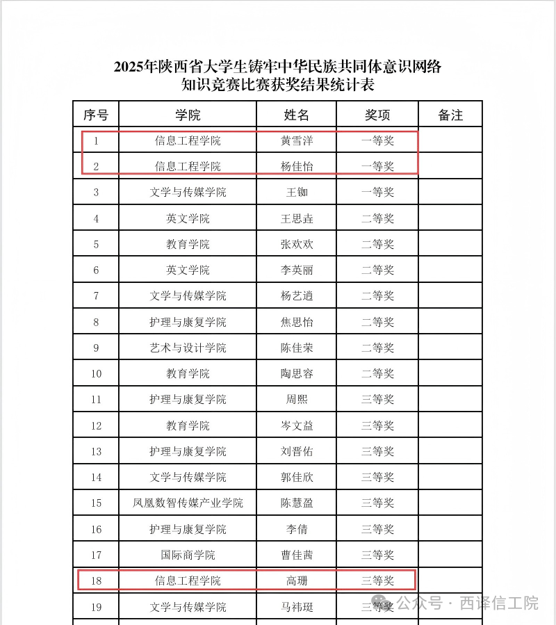 为了彰显信息时代青年的担当,赓续民族团结进步的精神血脉,信息工程学院积极响应学校党委统战部号召,于本月初组织学生参加2025年陕西省大学生铸牢中华民族共同体意识网络知识竞赛。在学院的精心组织和同学们的共同努力下,我院学子在竞赛中展现了扎实的理论素养和深厚的家国情怀,为学校争得了荣誉。
